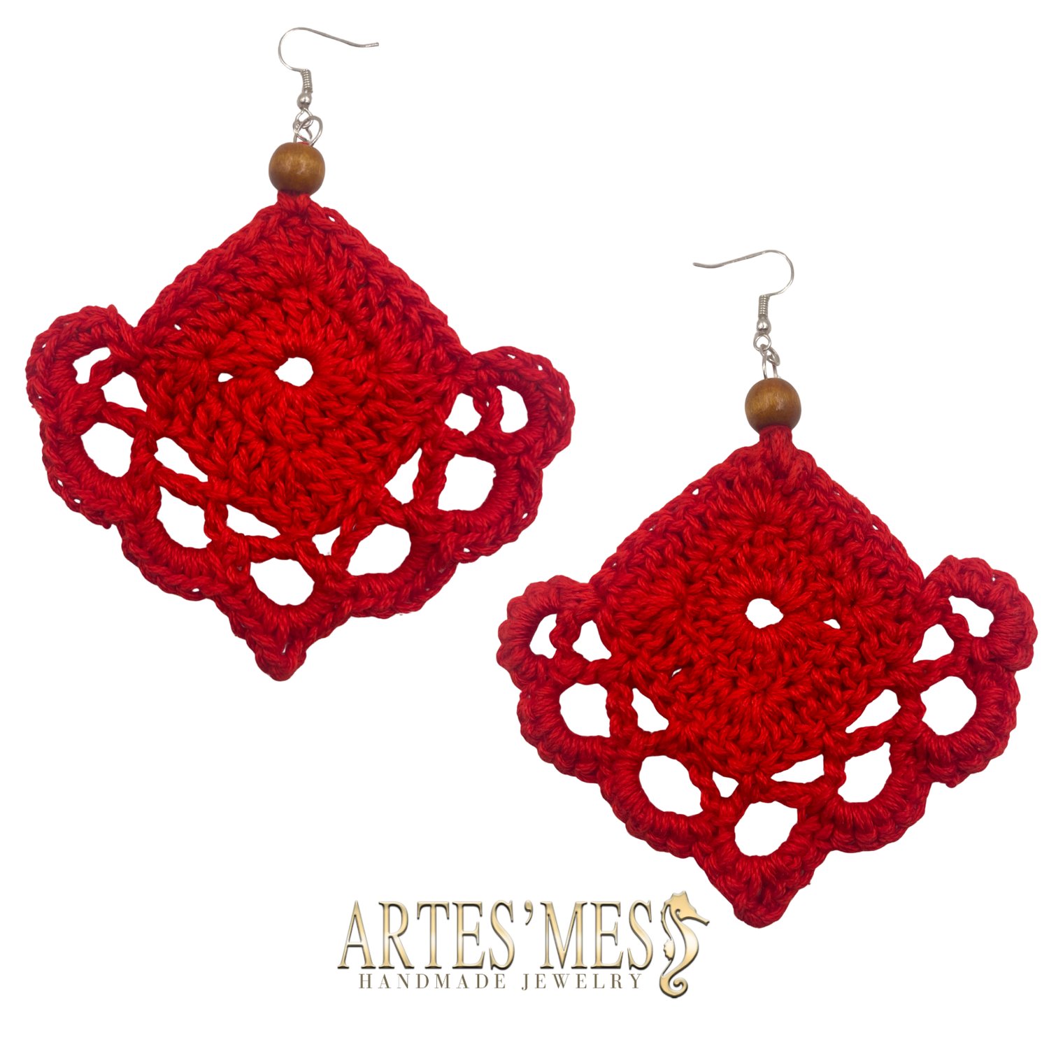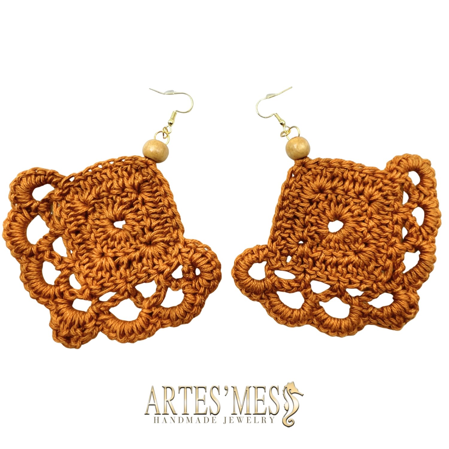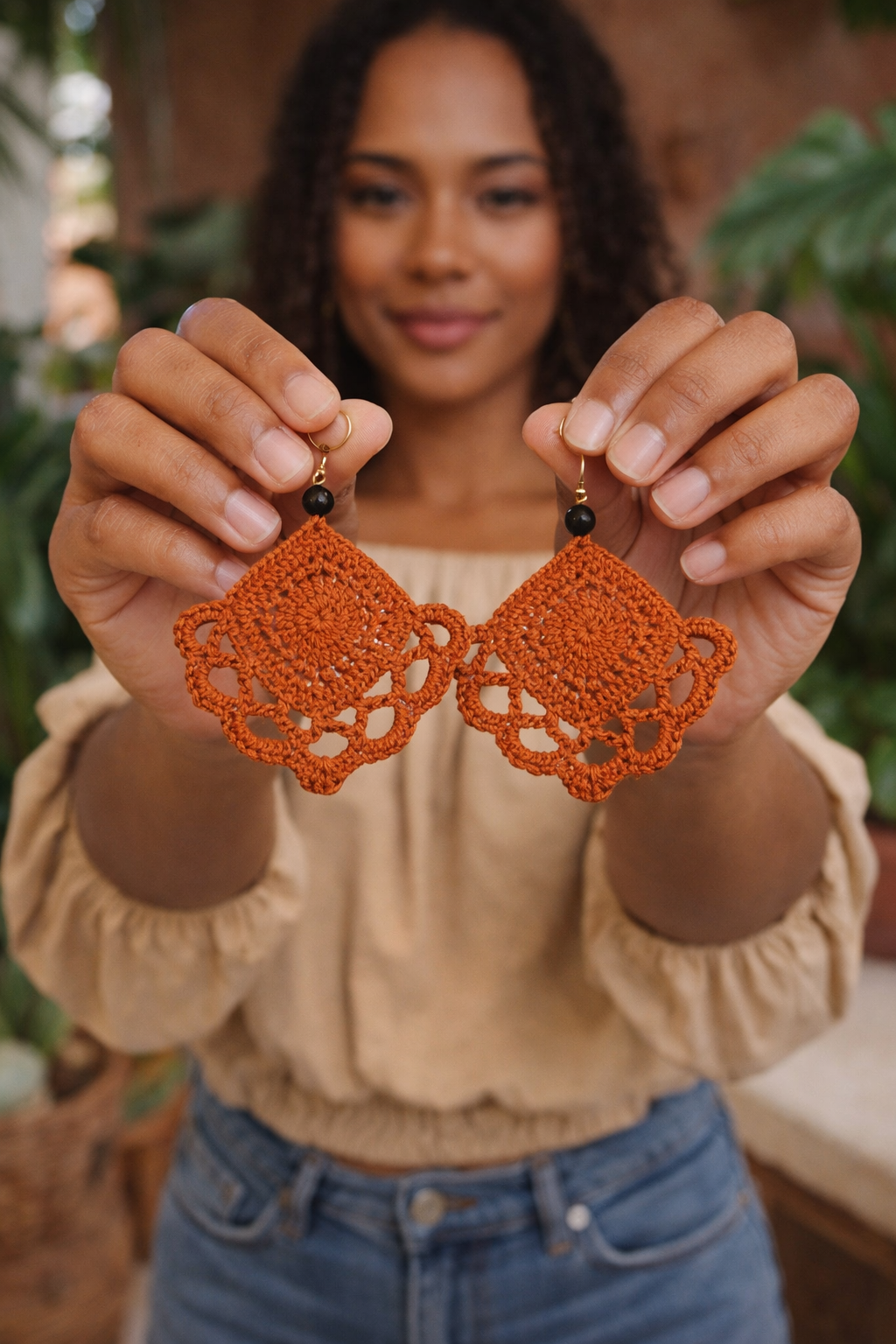 These earrings begin with a small granny-square-style motif that you can remix in countless ways—solid, open, textured, or decorative. As long as the starting motif is square, the rest of the pattern flows beautifully into an airy, sculptural design. This foundation gives the earrings a modern boho look, while the final scalloped edge adds movement and softness.