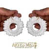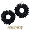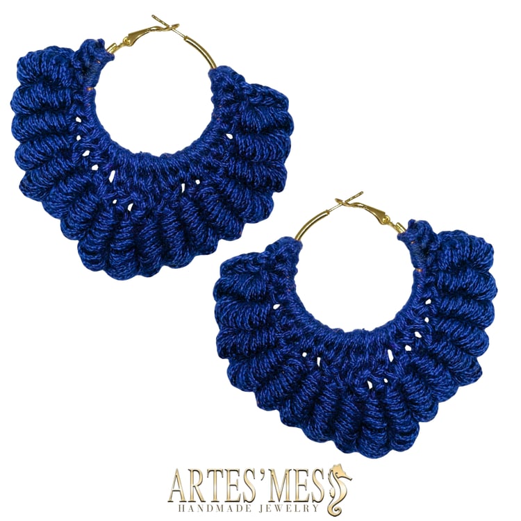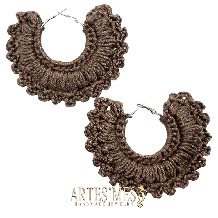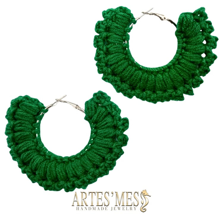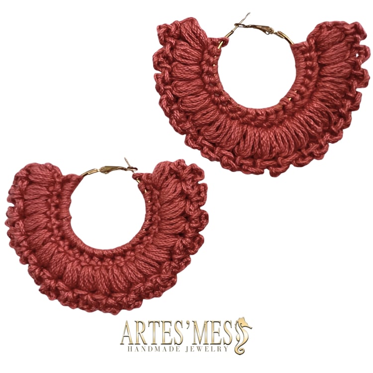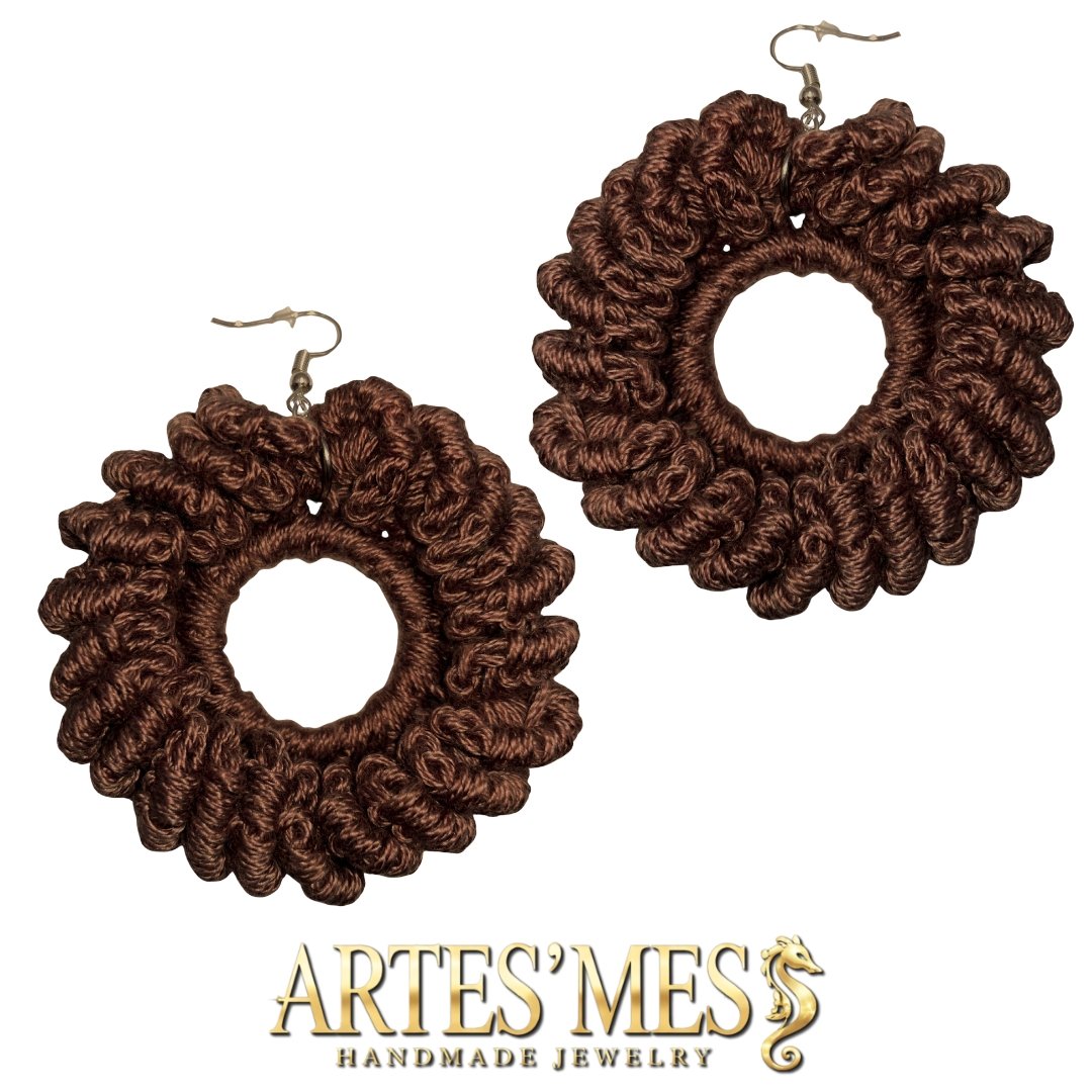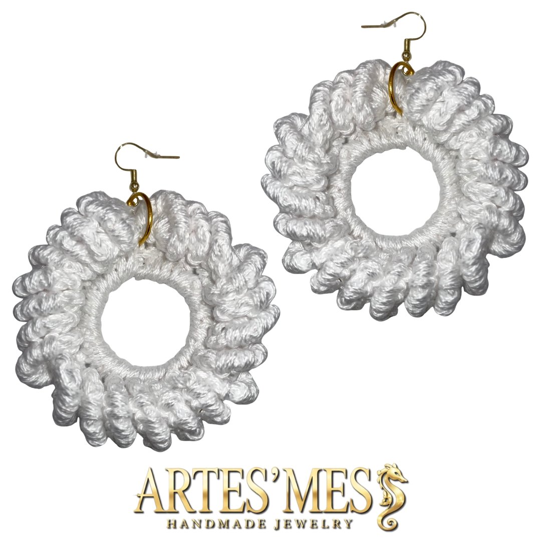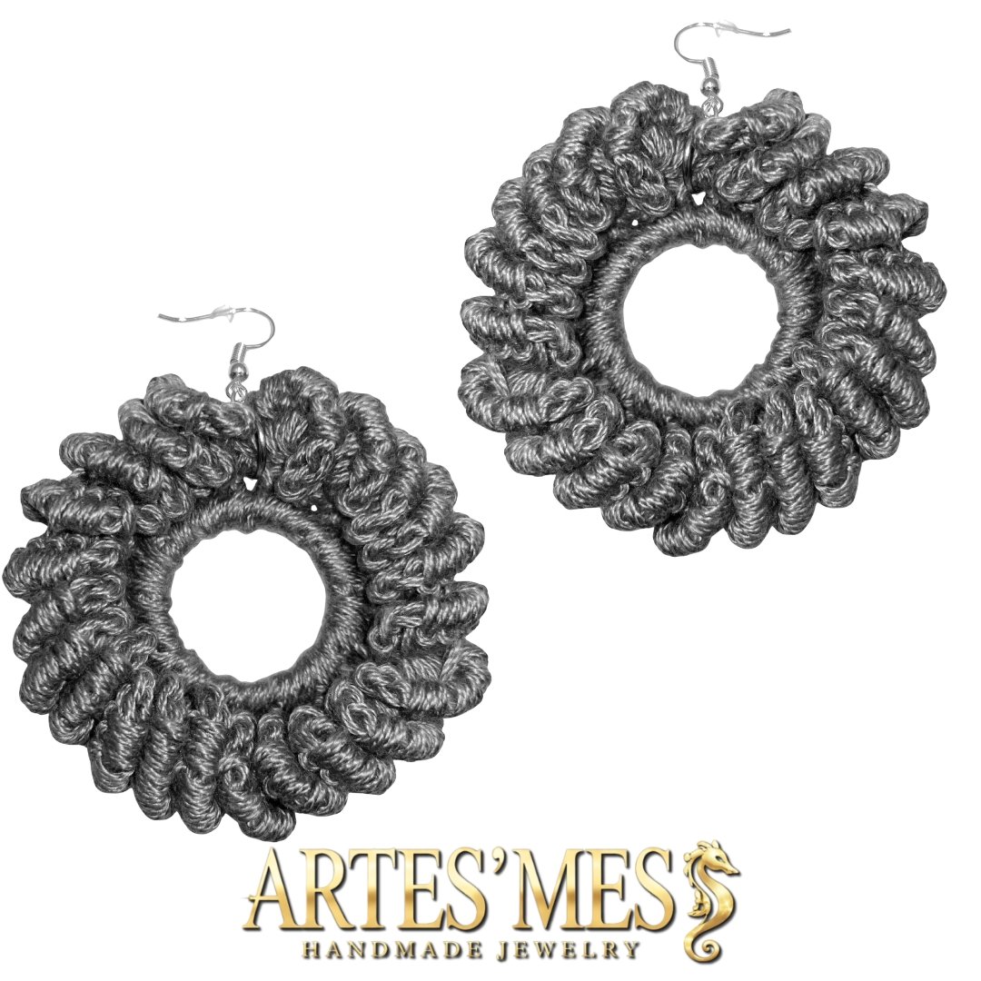 These earrings feature a 30 mm charm ring wrapped in single crochet and surrounded by a striking border of elongated loops that appear to coil around the edge like tiny sculpted spirals. The loops rise outward in a clean, rhythmic pattern, giving the earrings a bold and dimensional finish that looks far more intricate than the technique actually is. When worked in cotton, the structure stays crisp, creating a polished frame that elevates the simple metal ring into a fully textured piece of fiber art.