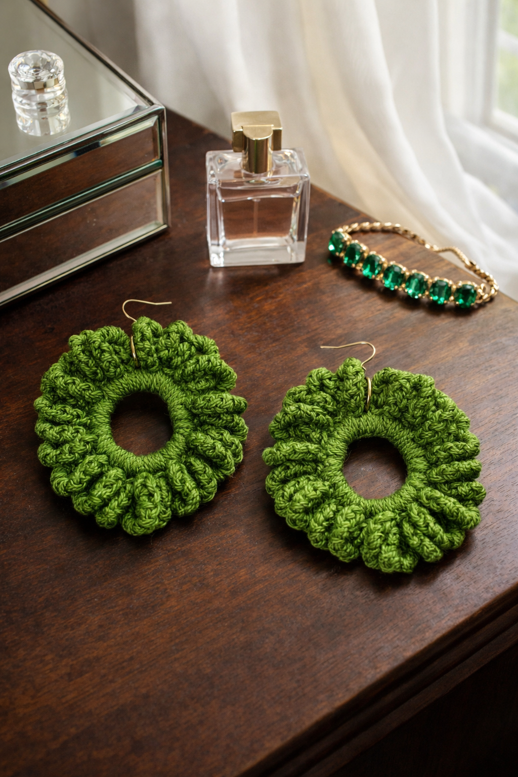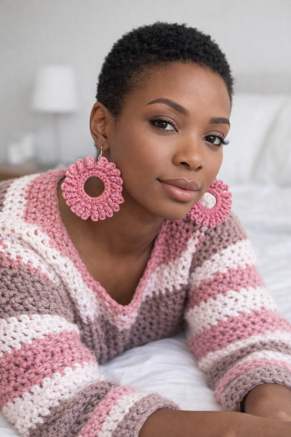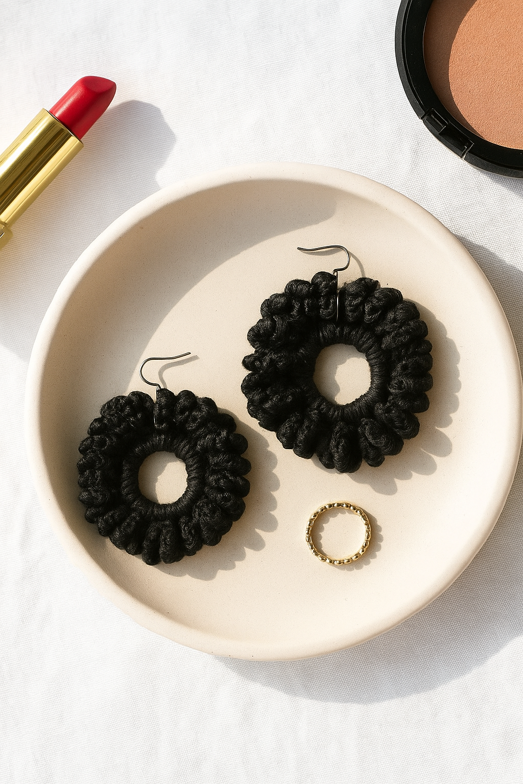 Because each loop is built by pulling up multiple stitches along a chain and closing them all at once, they stack neatly, forming a coiled effect that wraps the entire circumference. This gives the earrings a modern, architectural silhouette—almost like a miniature wreath or twisted rope—while still feeling lightweight and effortless to wear. The rings stay structured thanks to the foundation row of single crochets, giving the loops a stable base to bloom from.